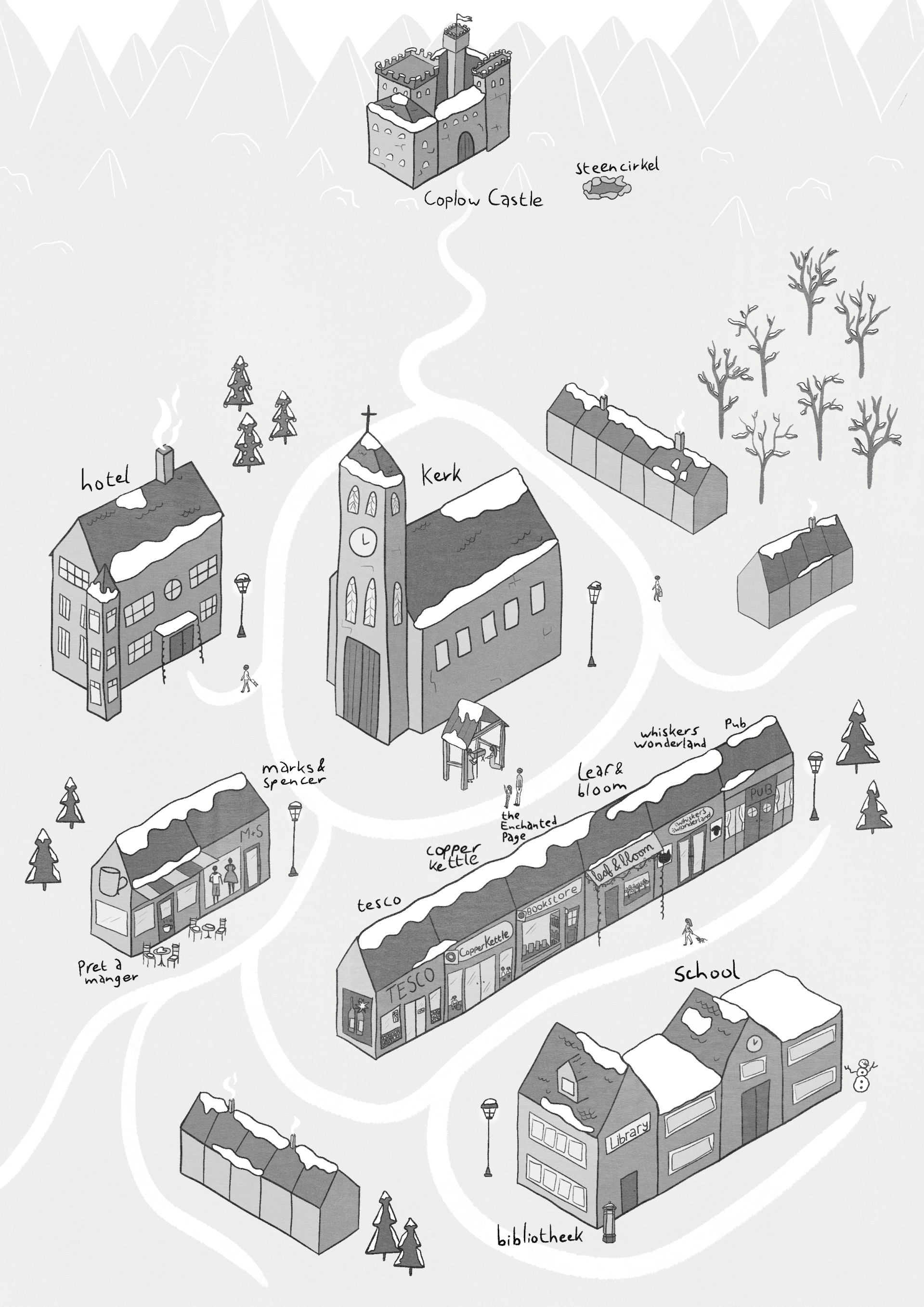 Doel kaart van het fictieve dorp Hucklow Dale voor in het boek Winterwonder in het Peak District