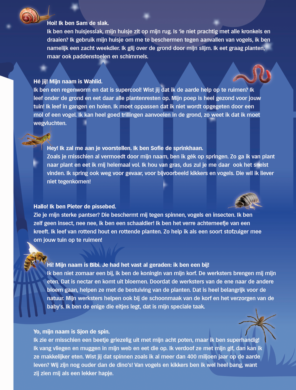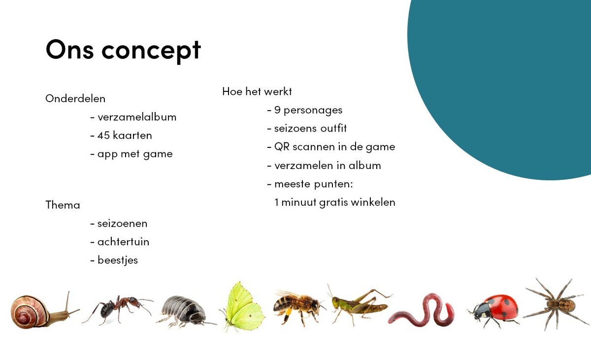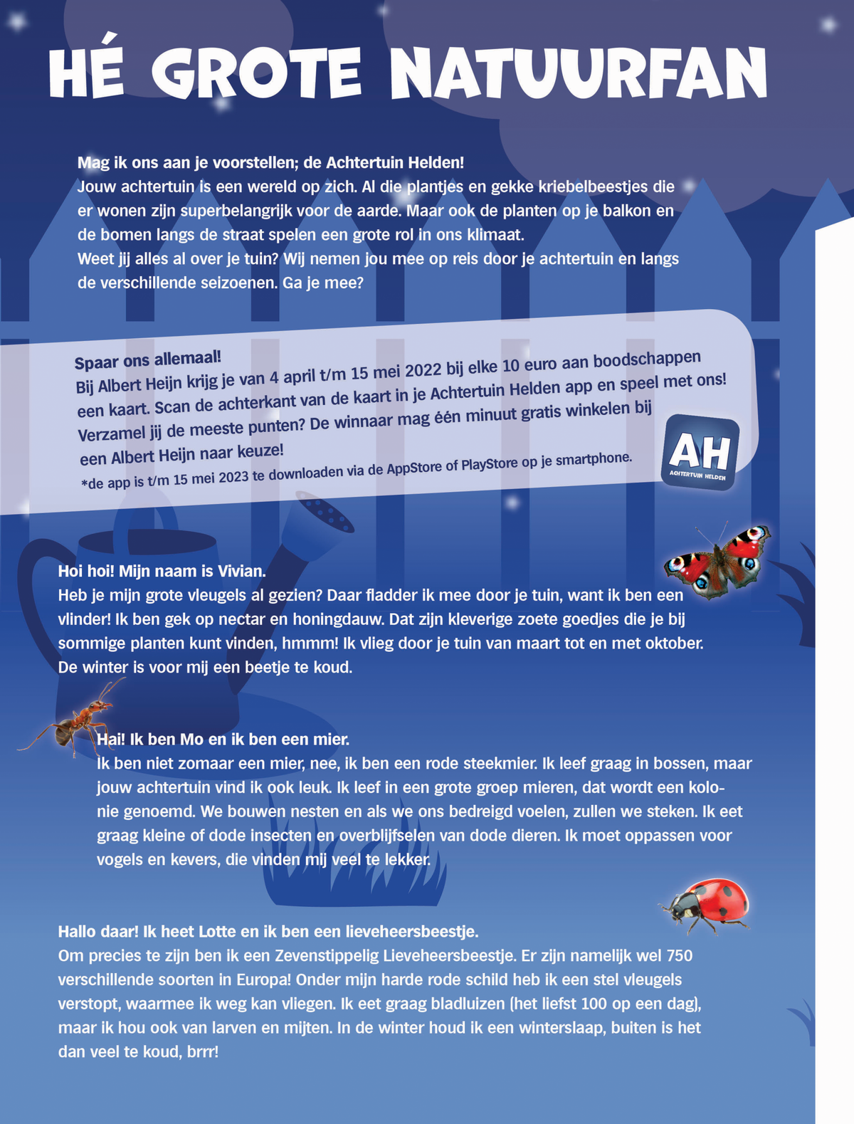 Als thema kozen we de natuur, en dan specifiek de achtertuin. Het doel is om tijdens het spelen te ontdekken en leren. De actie richt zich op kinderen. Het idee is om een game te maken die je gratis kunt spelen. Bij je boodschappen ontvang je spaarplaatjes, die je in de game kunt gebruiken voor extra personages of seizoenskrachten om het spel te winnen. De kaartjes kun je bewaren in een map.