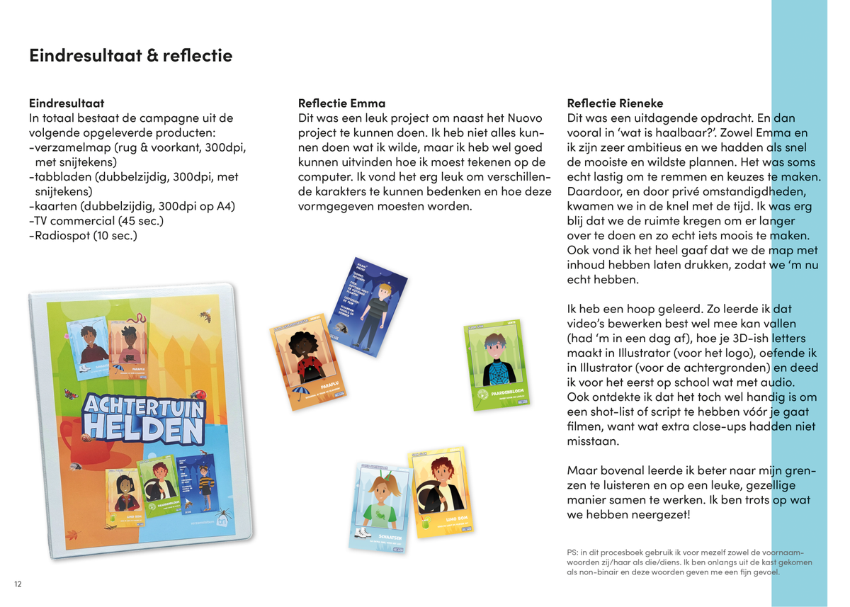 De samenwerking met Emma vond ik ook erg fijn. Onze communicatie was duidelijk en gezellig, we wisten precies wat we aan elkaar hadden. Onze docent was onder de indruk. We hadden alles veel gedetailleerder uitgewerkt dan verwacht. Zelf vond ik het jammer dat we geen tijd meer hadden om elk personage een seizoens-outfit te geven en verschillende krachten te bedenken. Emma had minder tijd voor dit project, waardoor de game er niet meer is gekomen. Dat is jammer, maar ik denk dat het concept toch goed duidelijk is geworden. Ik ben heel blij met het resultaat!
