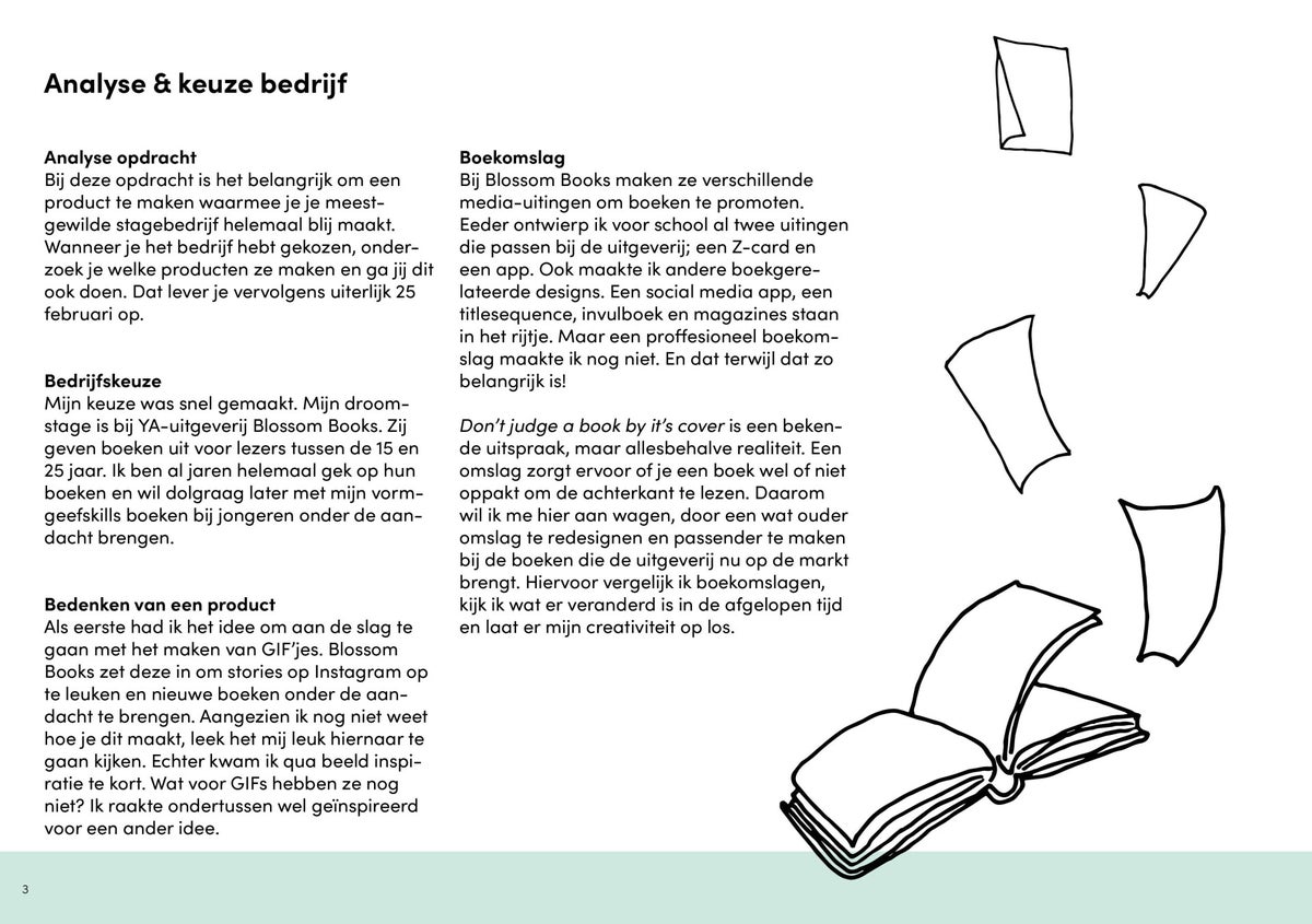 Deze schoolopdracht heette stageskills. Misschien kun je al wel raden wat de bedoeling was; het kiezen en ontwerpen van een product dat aansluit bij jouw nummer één stagebedrijf. In mijn derde en laatste jaar ga ik namelijk acht maanden stage lopen en tijdens dit project waren we volop bezig met het zoeken van een geschikte plek. Mijn keuze was snel gemaakt. Ik koos voor mijn favoriete uitgeverij Blossom Books. Het lijkt mij geweldig om mijn liefde voor boeken te kunnen combineren met mijn passie voor vormgeving.